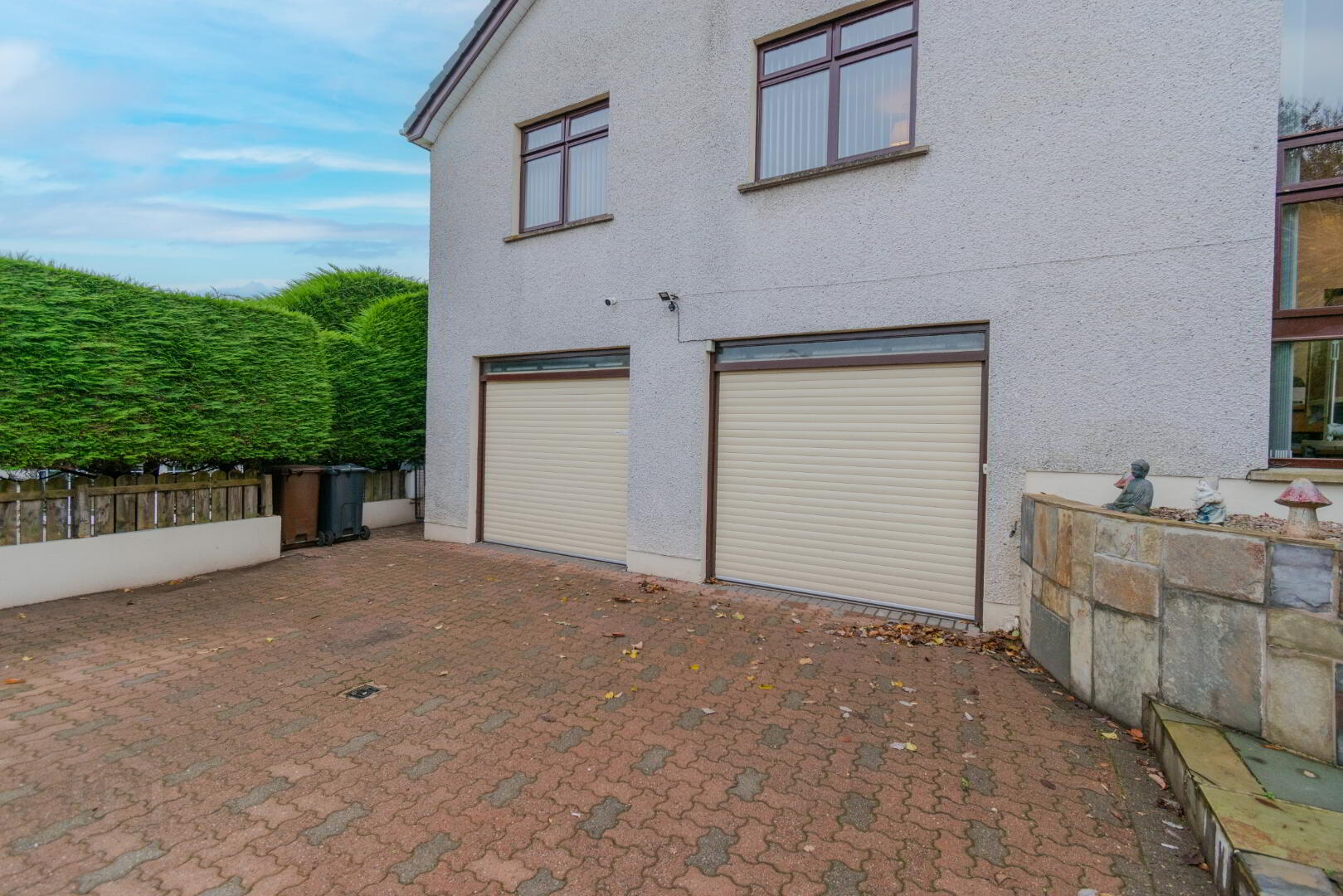 Paviour Drive fitting Multiple Vehicles, Entrance Pillars with Lighting, Mature Shrubbery & Foliage, Pedestrian Access to Rear, Access to Garage, Raised Pond, Raised Planters & Slate Steps to Front Door, Outside Lighting, Outside Tap, PVC Fascia & Guttering.