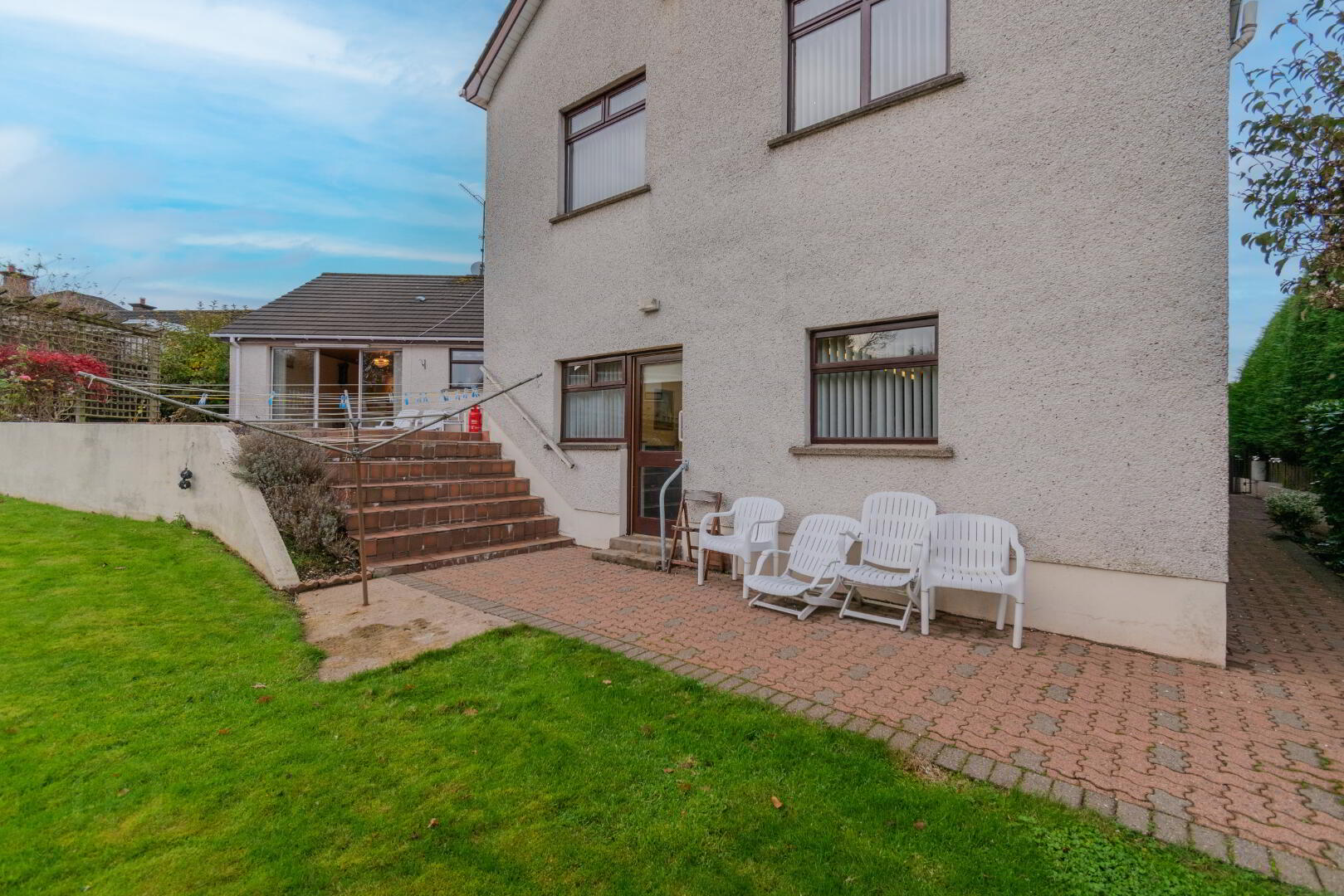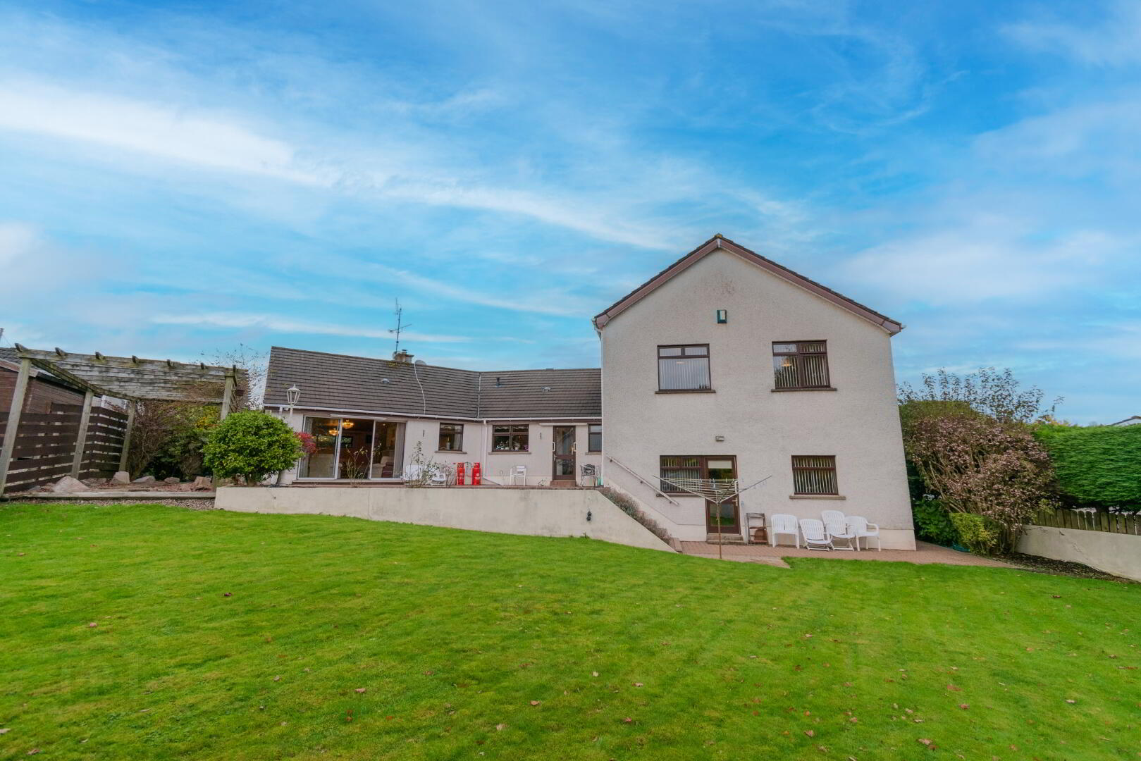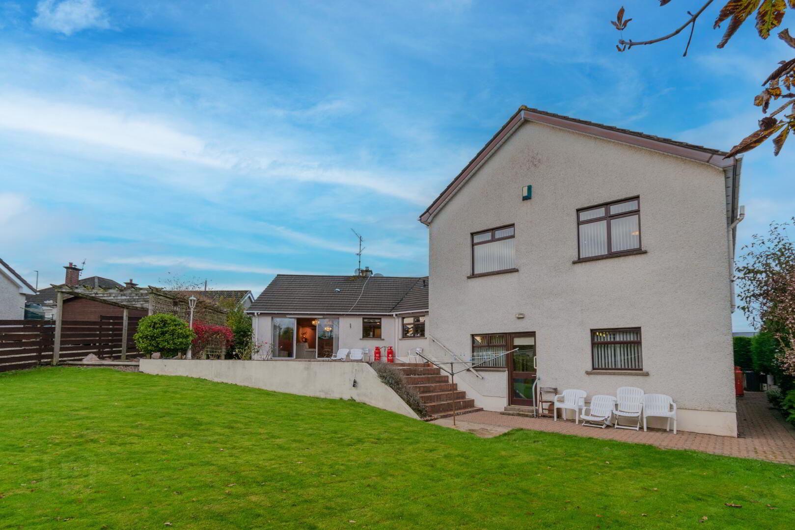 Gardens Laid in Lawn, Tiled Upper Patio Area leading to Lower Patio via Steps, Stoned Pergola Area with Mature Shrubbery, Oil Tank, Outside Lighting, Outside Tap, PVC Fascia & Guttering.