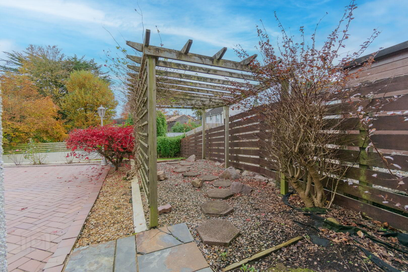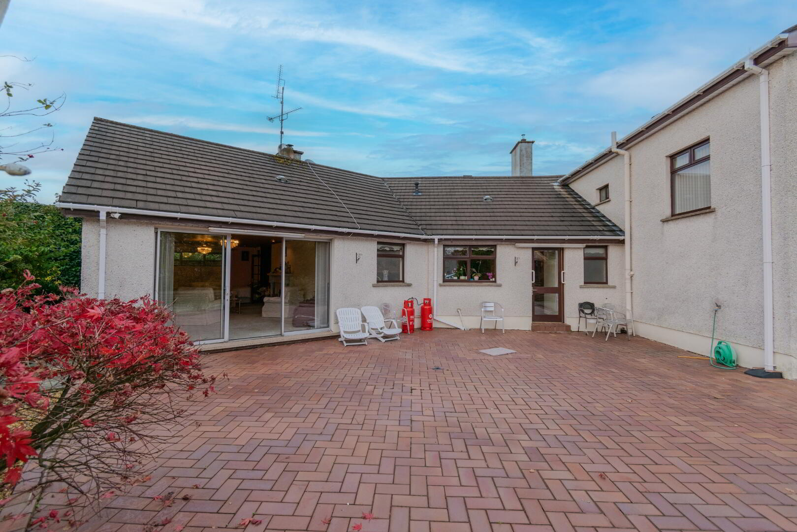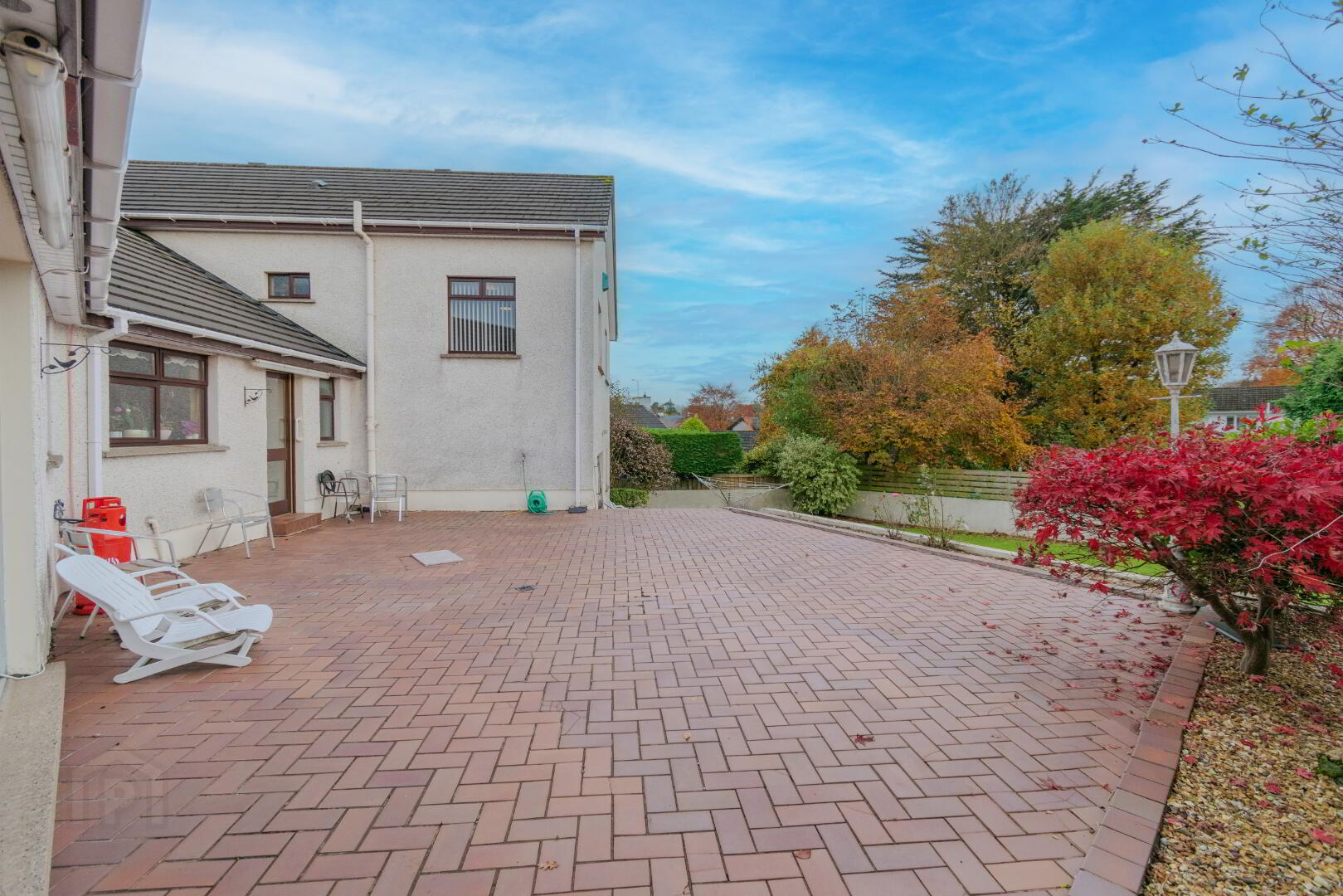 Gardens Laid in Lawn, Tiled Upper Patio Area leading to Lower Patio via Steps, Stoned Pergola Area with Mature Shrubbery, Oil Tank, Outside Lighting, Outside Tap, PVC Fascia & Guttering.