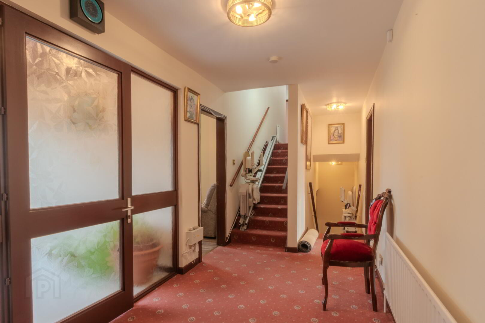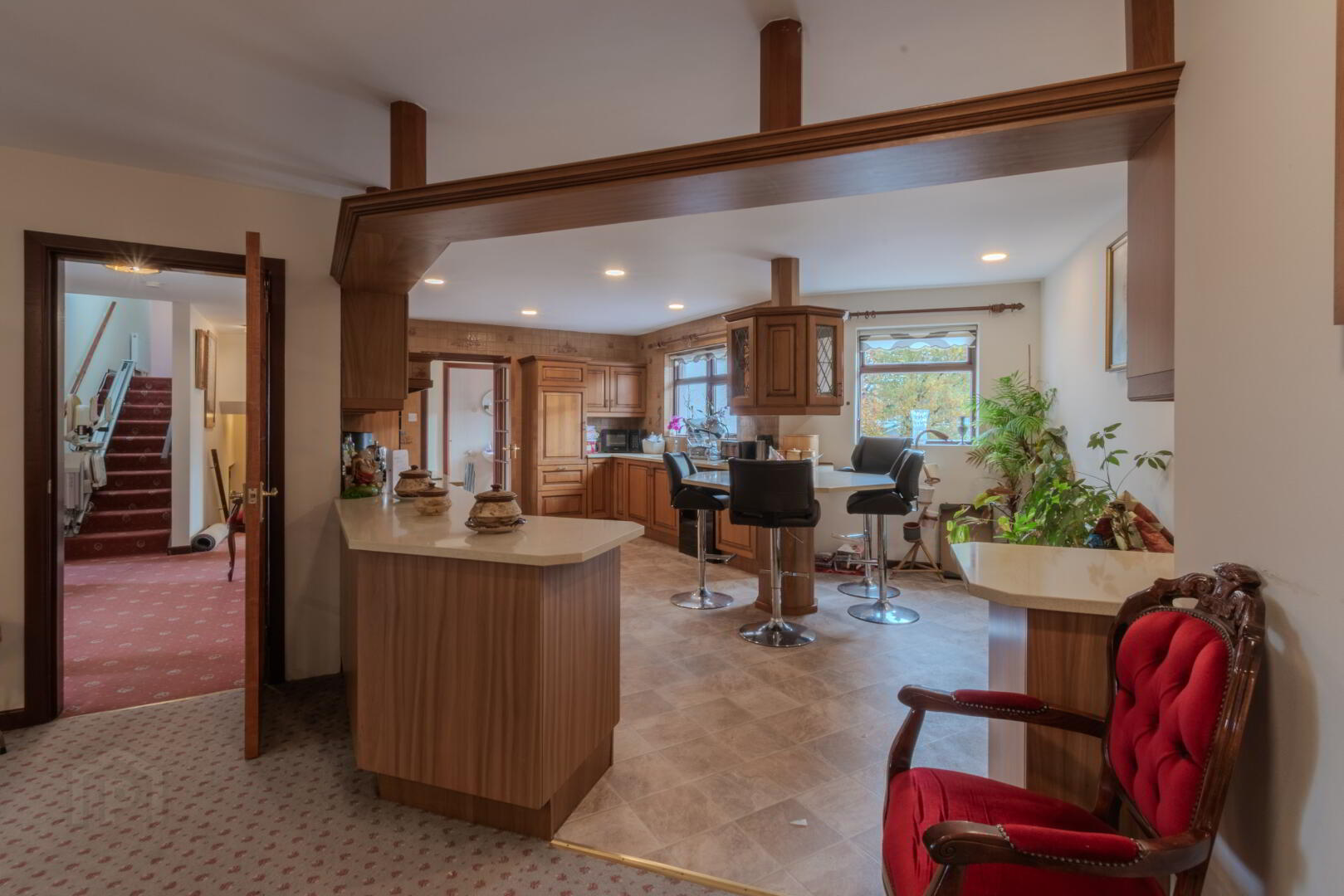 Carpeted Stairs, Solid Polished Stone Flooring, Leading to…