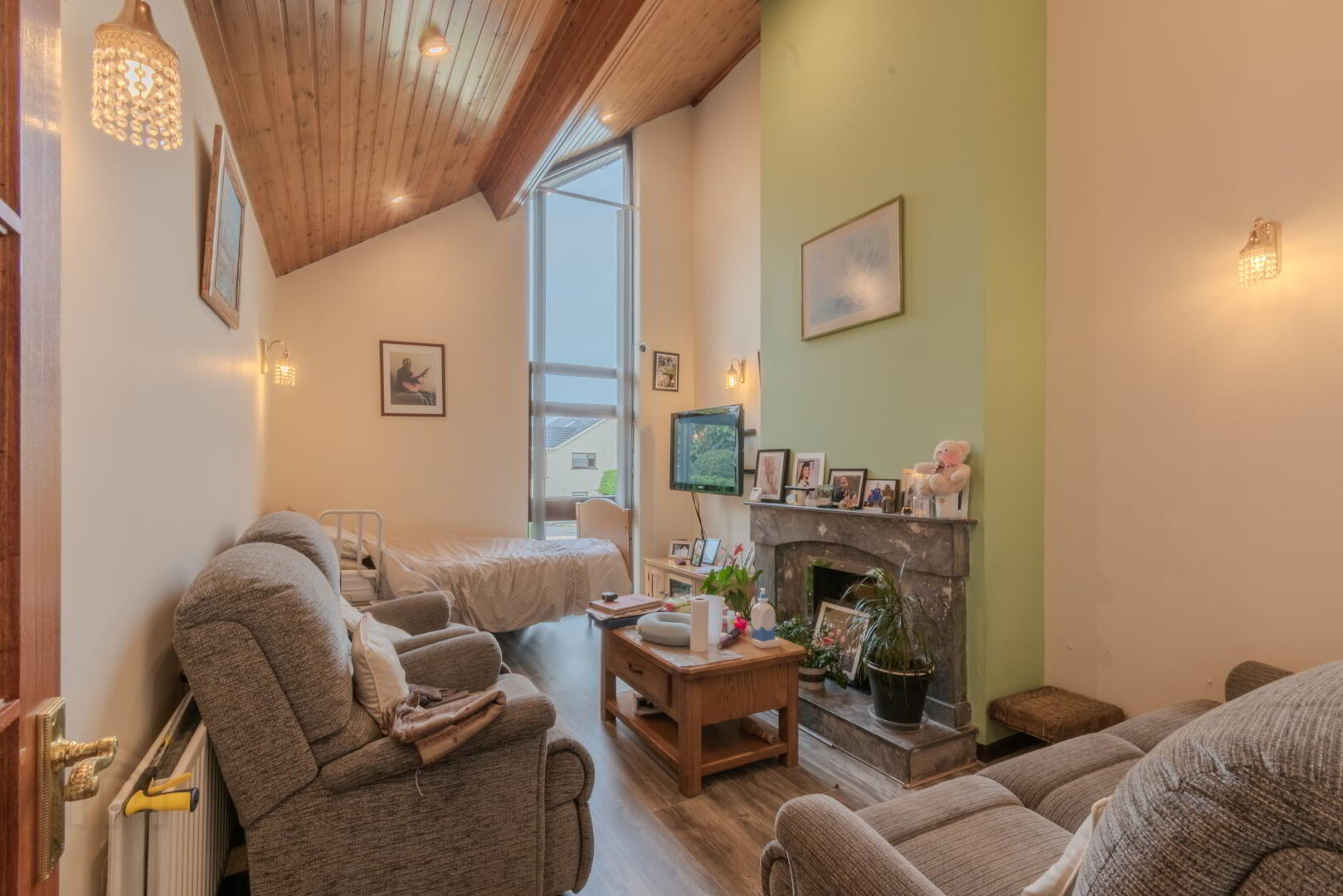 Wood Effect Laminate Flooring, Vaulted Ceiling with Floor-to-Ceiling Window, Open Fireplace with Decorative Marble Surround.