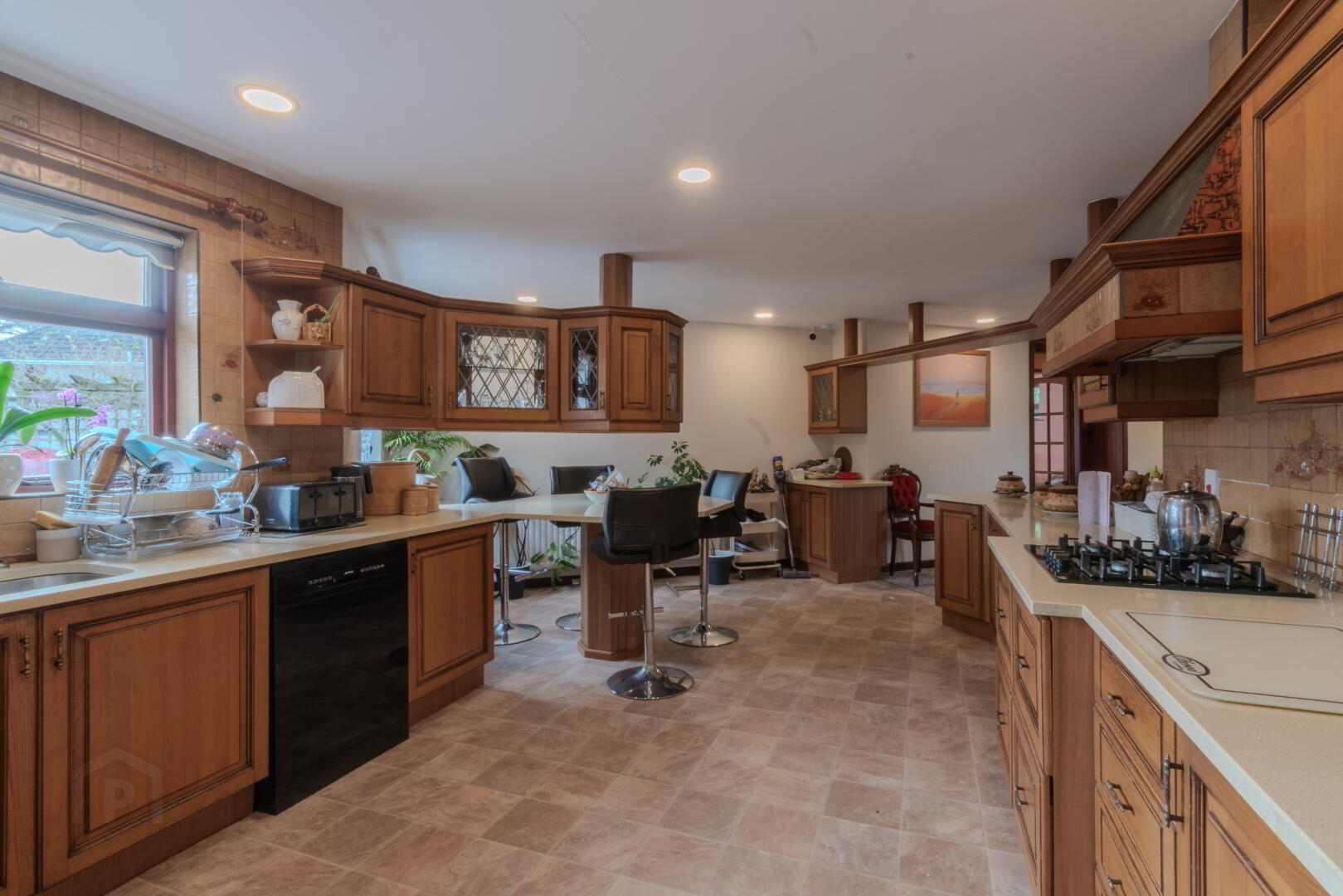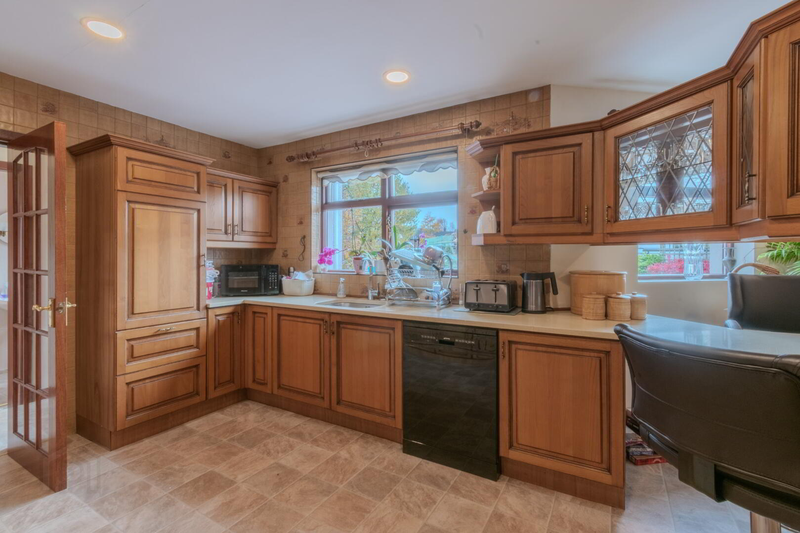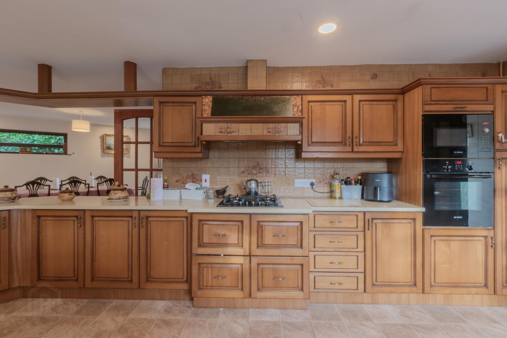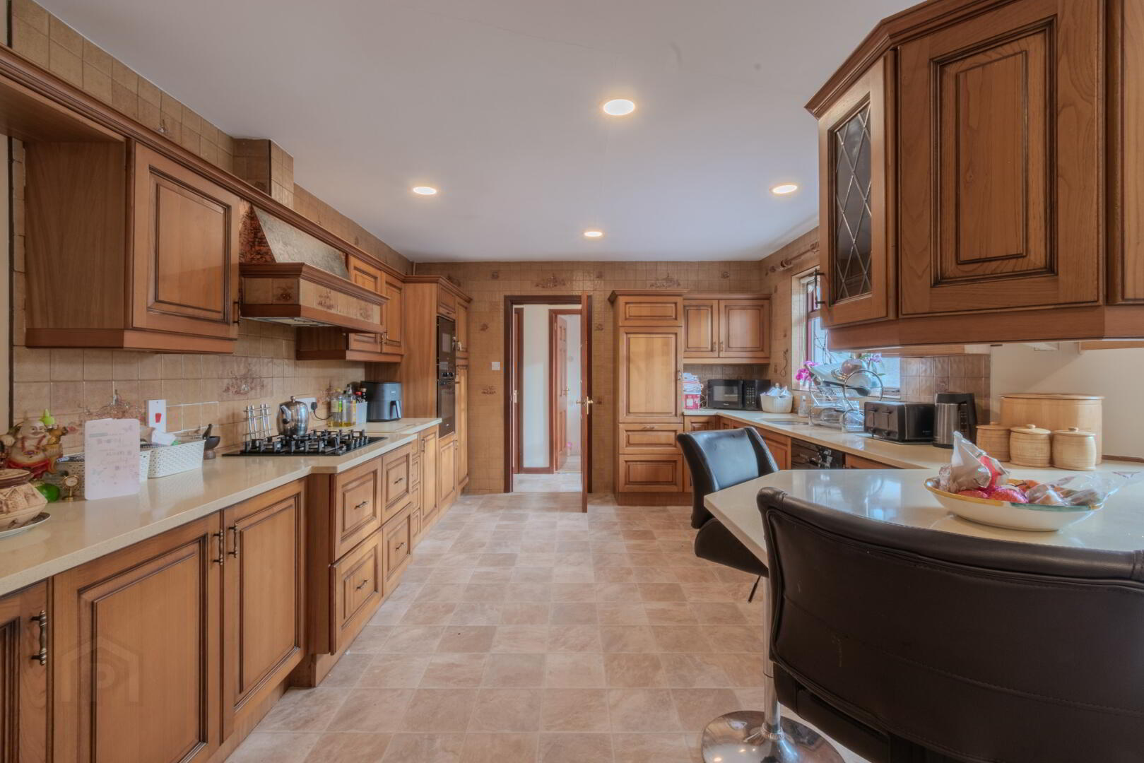 Tile Effect Linoleum Flooring, Solid Oak Eye & Low-Level Units with Pan Drawers and Larder Cupboard, Integrated Appliances (Fridge/Freezer, Electric Eye-Level Oven & Microwave, Gas Hob), Cream Quartz Countertop with Undermount Sink & Chrome Mixer Tap, Breakfast Bar, Extractor Fan with Copper Surround, 2x Windows to Rear, Spot Lighting, Radiator.