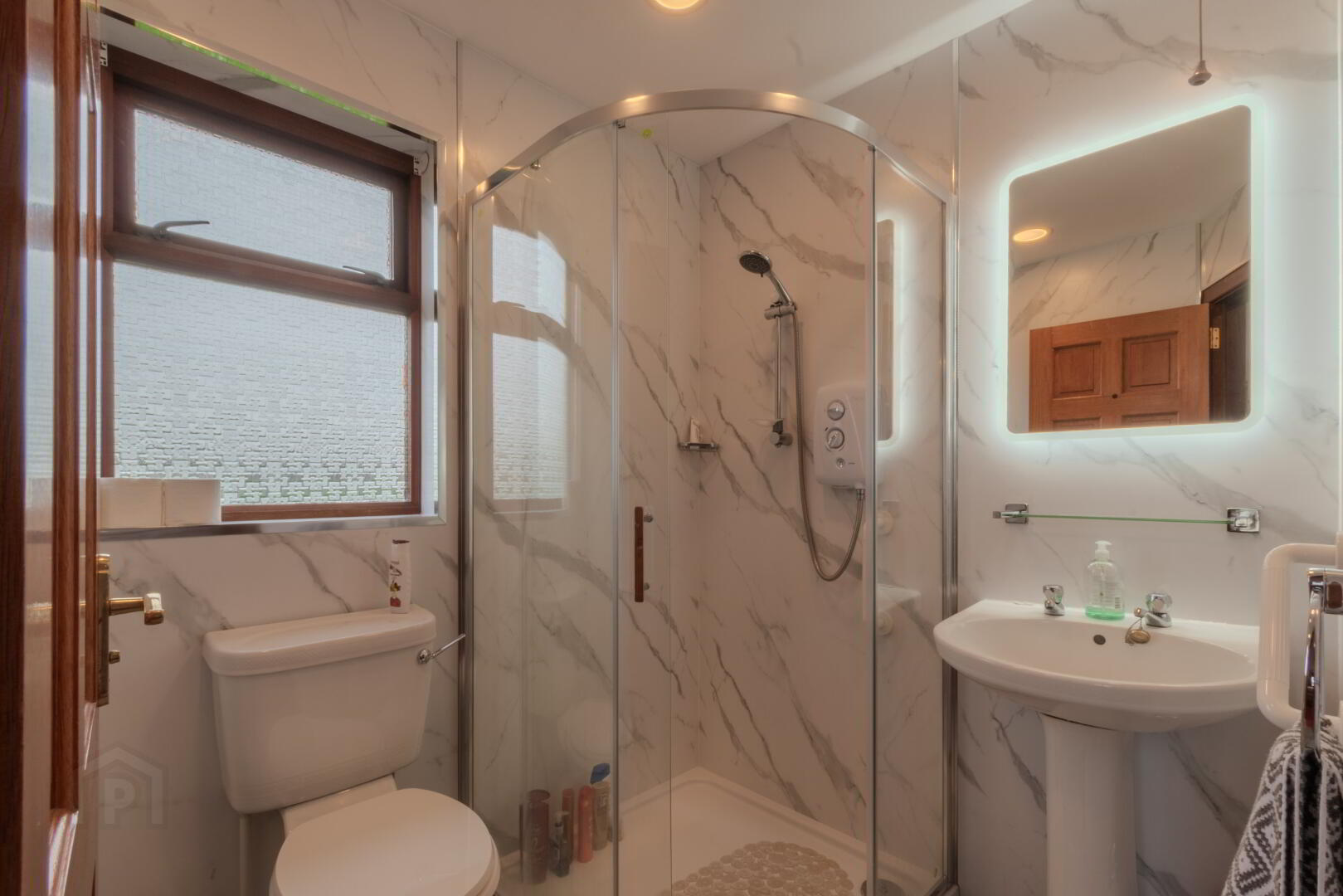 Wood Effect Laminate Flooring, PVC Panelled Walls, WC, Wash Hand Basin, Corner Enclosure with Mains Shower, Window to Side.
