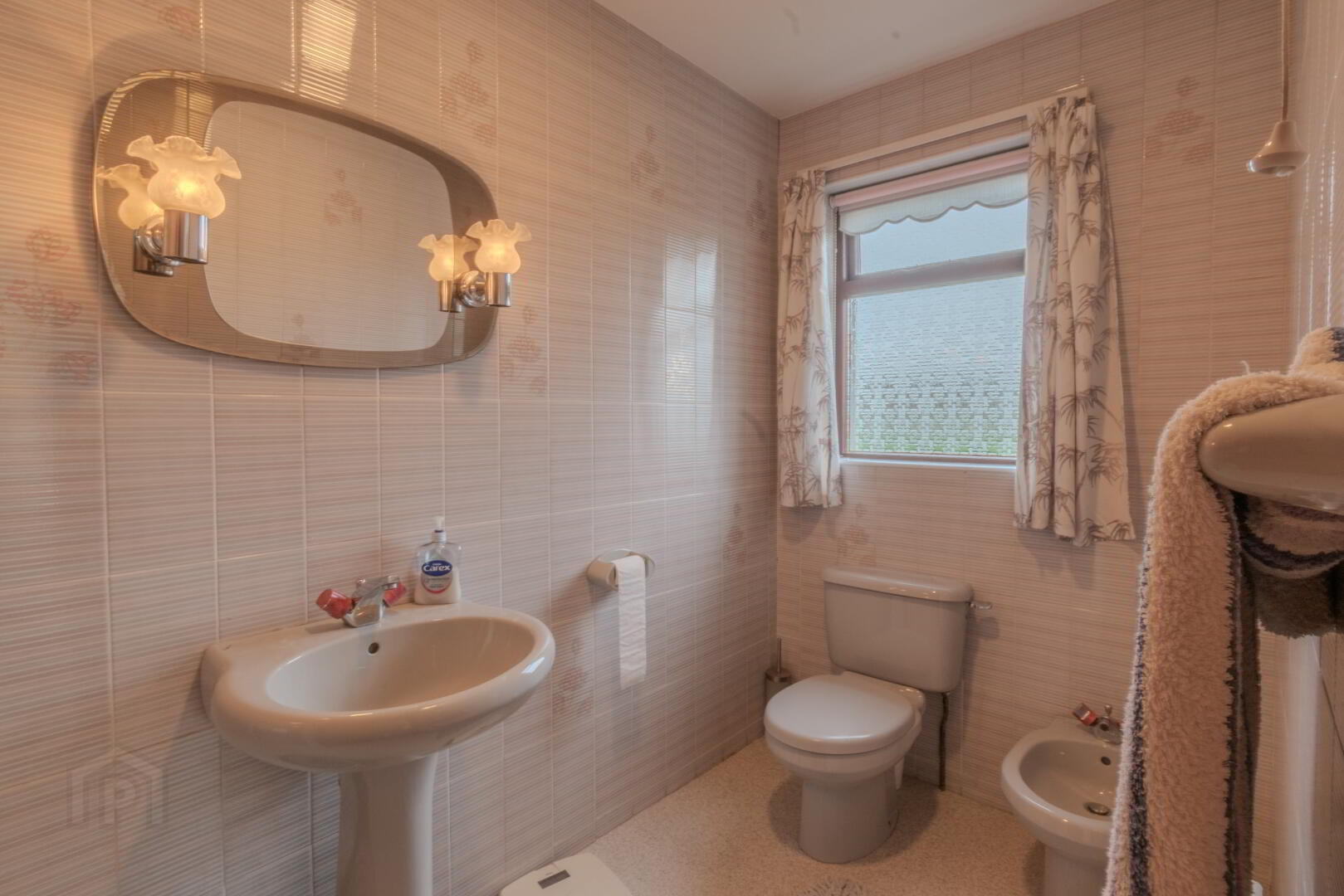 Linoleum Flooring, Fully Tiled Walls, 4-Piece Suite to include WC, Bidet, Wash Hand Basin and Shower Cubicle with Electric Shower, Storage Cupboard, Window to Side.