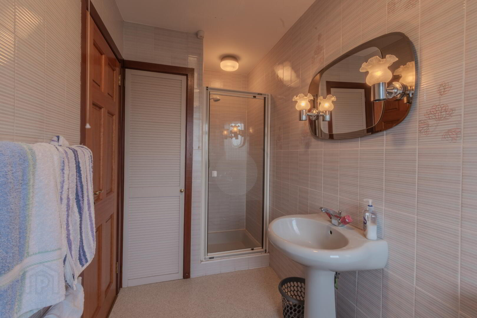 Fully Tiled Walls, Linoleum Flooring, Window to Side, 5-Piece Suite with Corner Jacuzzi Bath, Corner Enclosure with Mains Shower, Wash Hand Basin, WC & Bidet, Spot Lighting.