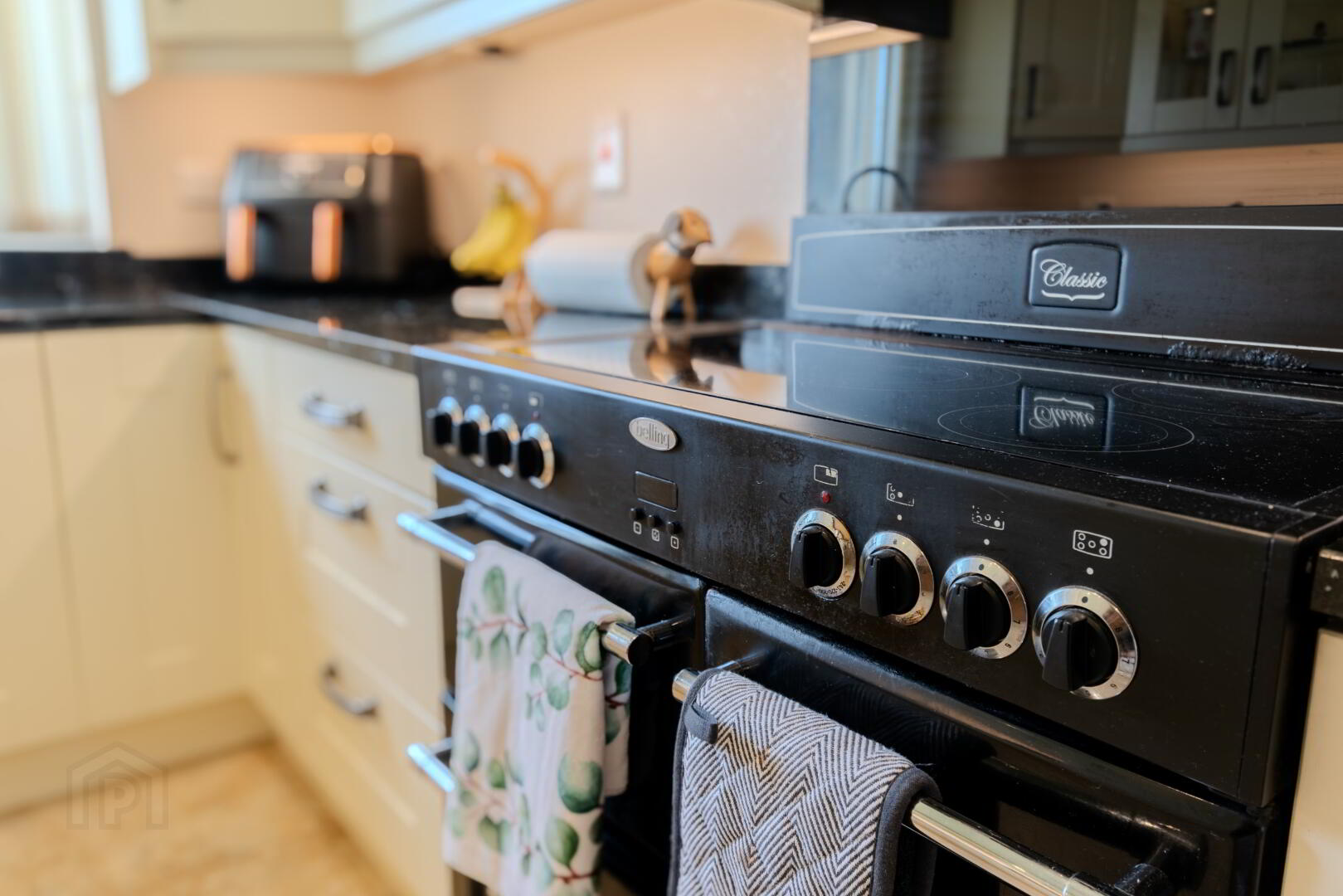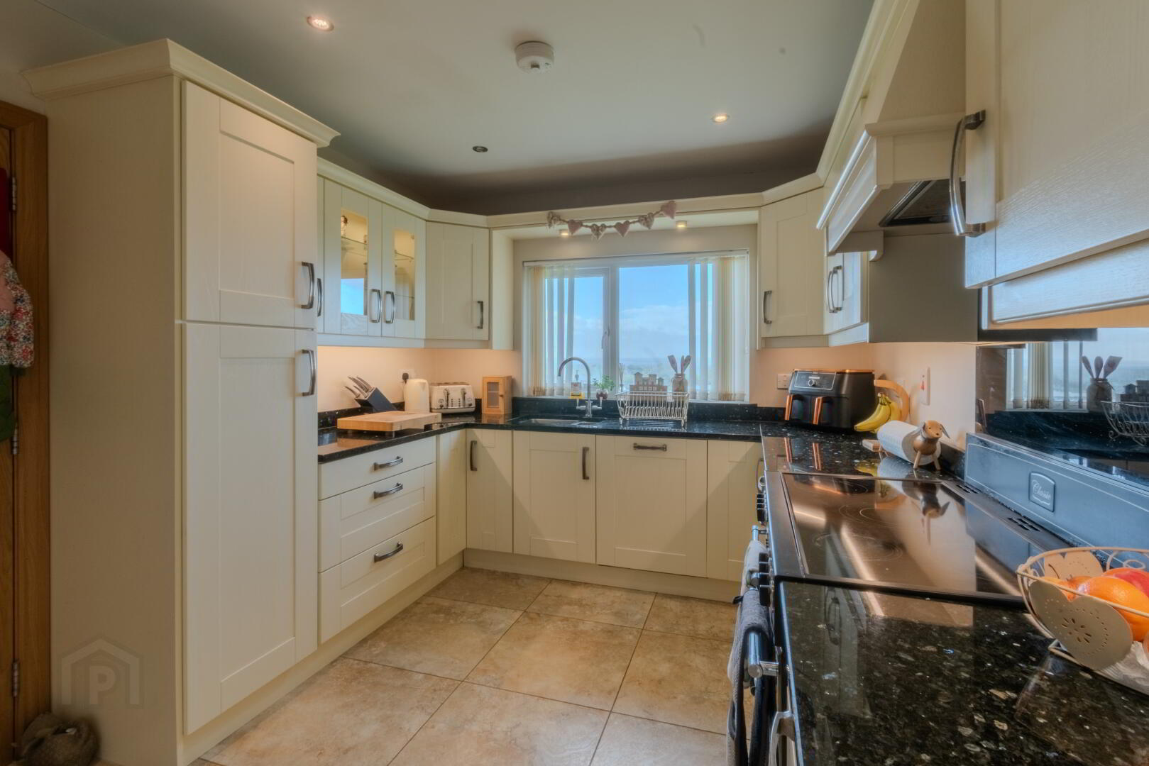 Tiled Flooring, Eye & Low-Level Wooden Units with Granite Countertop, Belling Electric Range Cooker, Franke 1.5 Bowl Sink and Drainer, Window overlooking Lough, Radiator, Socket Points, Recessed Spot Lighting, Larder Cupboard, Open to…