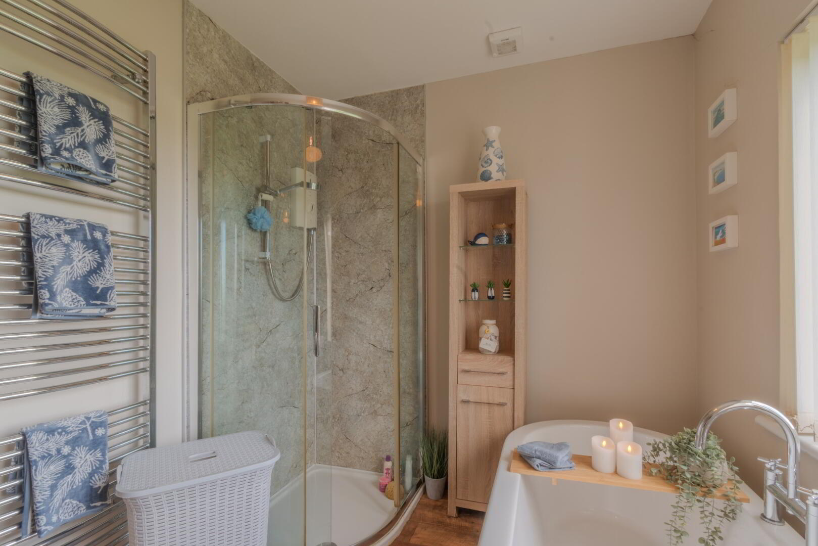 Linoleum Flooring, Window to Rear, Low-Flush WC, Corner Enclosure with Electric Shower, Bath, Wash Hand Basin, Radiator.