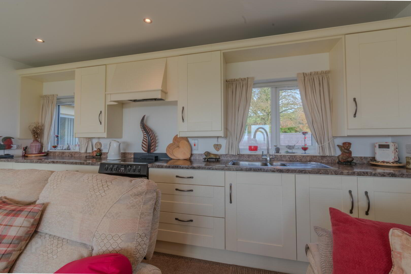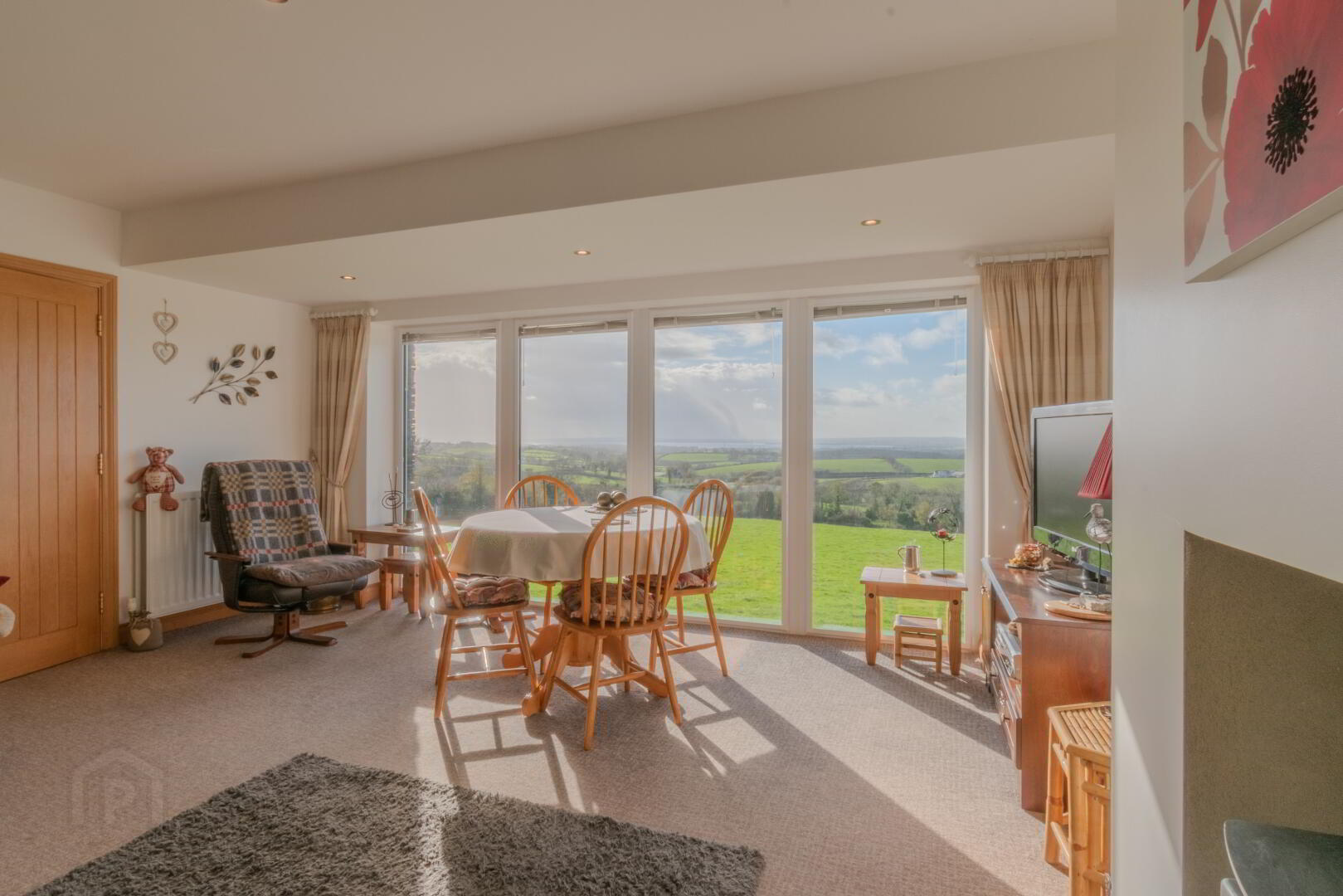 Carpeted Flooring, 2x Radiators, Woodburning Stove, Recessed Spot Lighting, Floor to Ceiling Windows overlooking Antrim Lough and Surrounding Countryside, Eye & Low-Level Wooden Units with Laminate Worktop, Socket Points, 2x Windows to Rear, Stainless Steel Sink & Drainer with Chrome Mixer Tap, Space for Cooker.