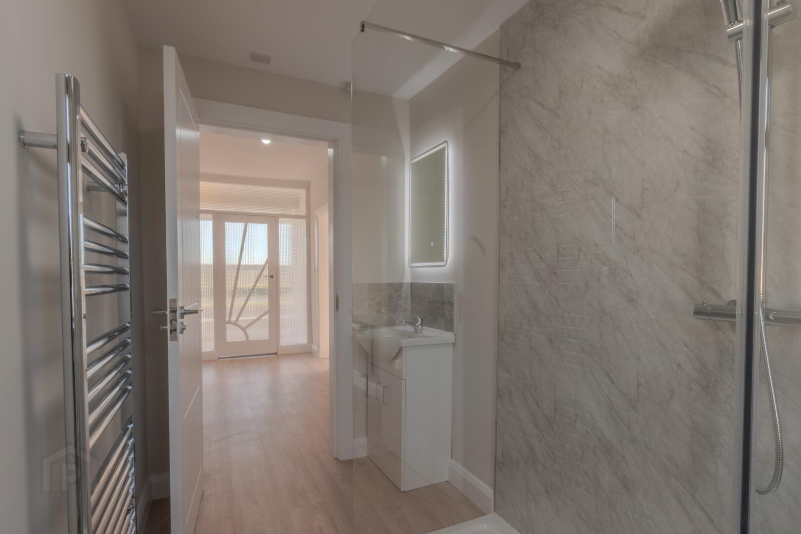 Shower Room with modern wash hand basin, low flush WC and walk-in shower.