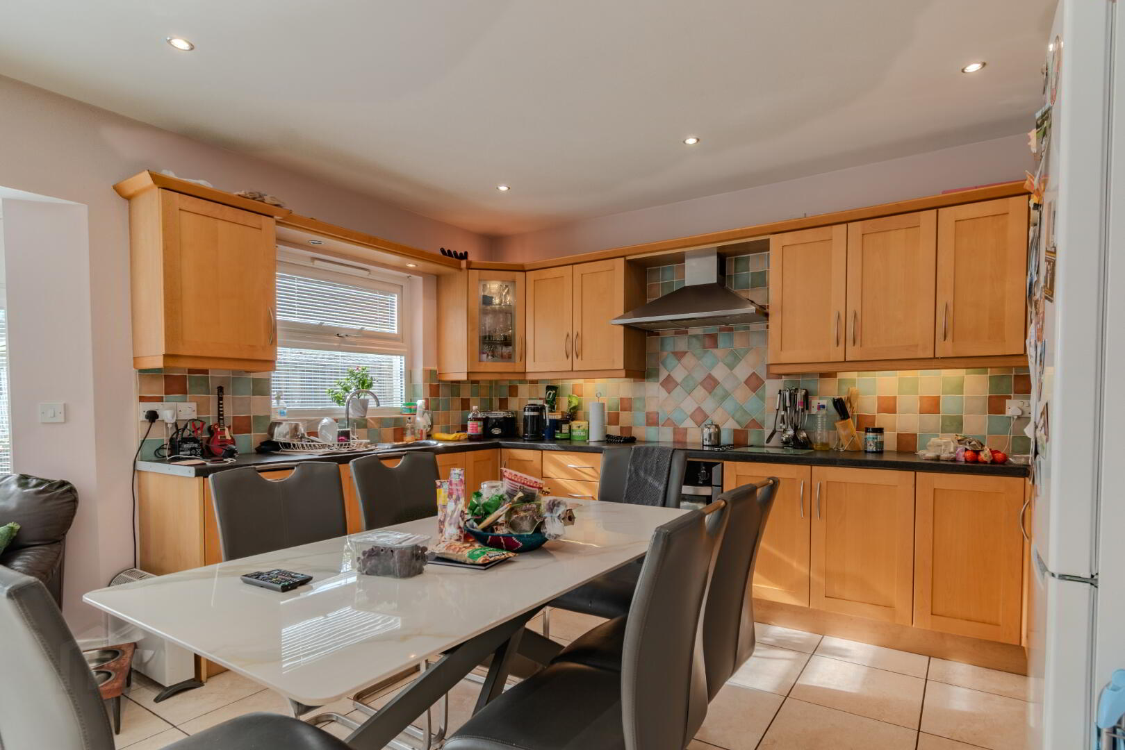 Tiled Flooring, Eye & Low-Level Solid Wood Units with Laminate Worktop, Stainless Steel 1.5 Bowl Sink & Drainer, Integrated Hob & Oven, Radiator, Socket Points, 3x Windows and Patio Door to Rear Garden, Recessed Spot Lighting.