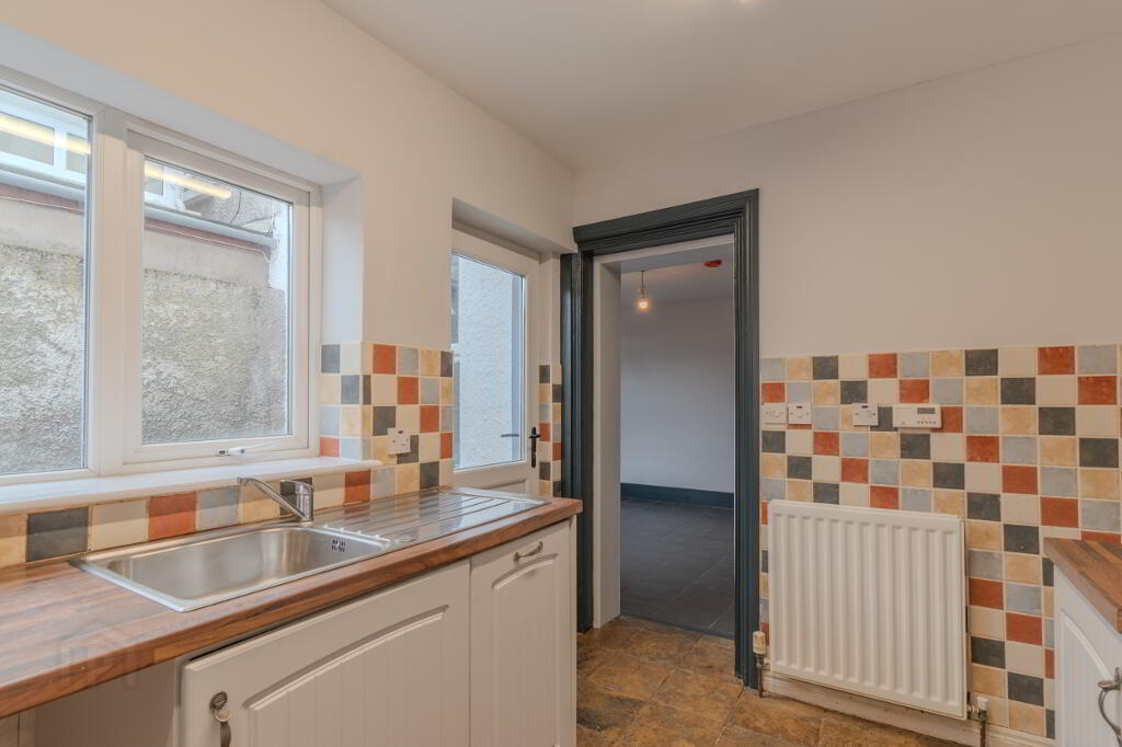 Slate Tile Flooring, ½ Tiled Walls, Eye & Low-Level Farmhouse-Style Fitted Units with Wood Effect Laminate Worktop, Window & Door to Rear Decking, Stainless Steel Sink & Drainer with Mixer Tap, Space for Cooker Unit, Plumbed for Auto, Radiator, Socket Points.