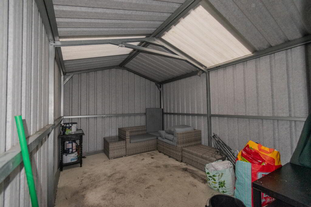 Fully concreted & enclosed yard with oil tank, mature shrubbery and Steeltech shed