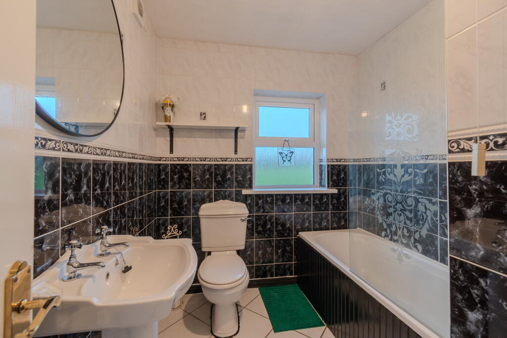 Three-piece suite to include wash hand basin, WC and bath with electric shower over, fully tiled walls